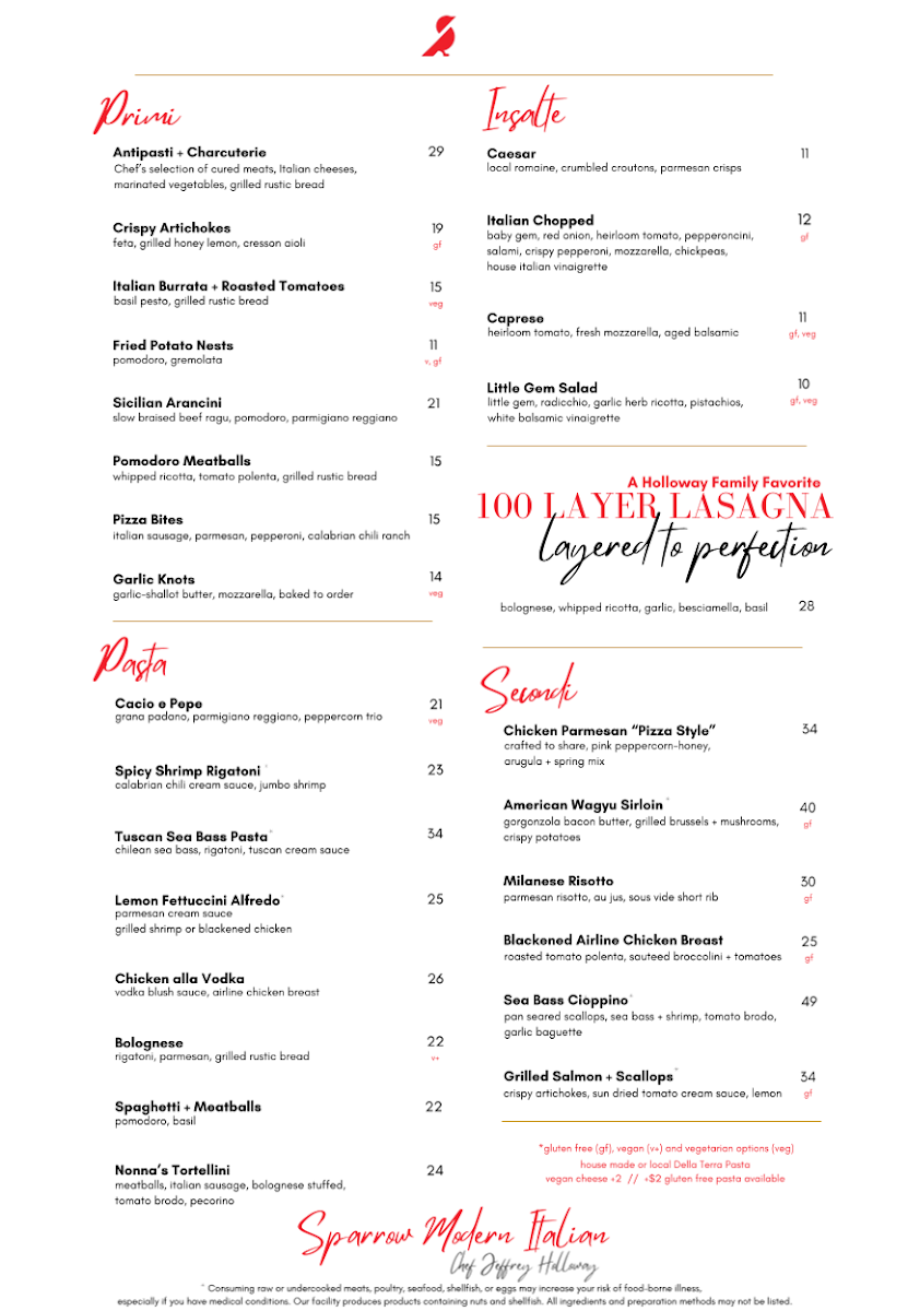 For those craving hearty entrees, Sparrow Modern Italian delivers with standout dishes like the decadent 100-Layer Lasagna and the crispy Chicken Parmesan "Pizza Style". The Grilled Salmon + Scallops and the Grilled American Wagyu Sirloin are perfect for seafood and steak lovers alike, while the Blackened Airline Chicken offers a spicy and flavorful alternative.