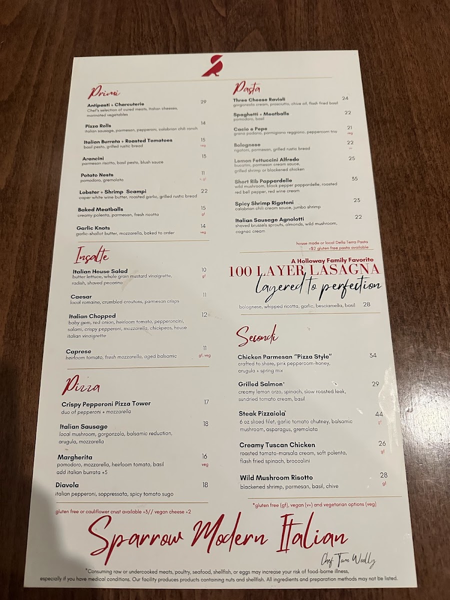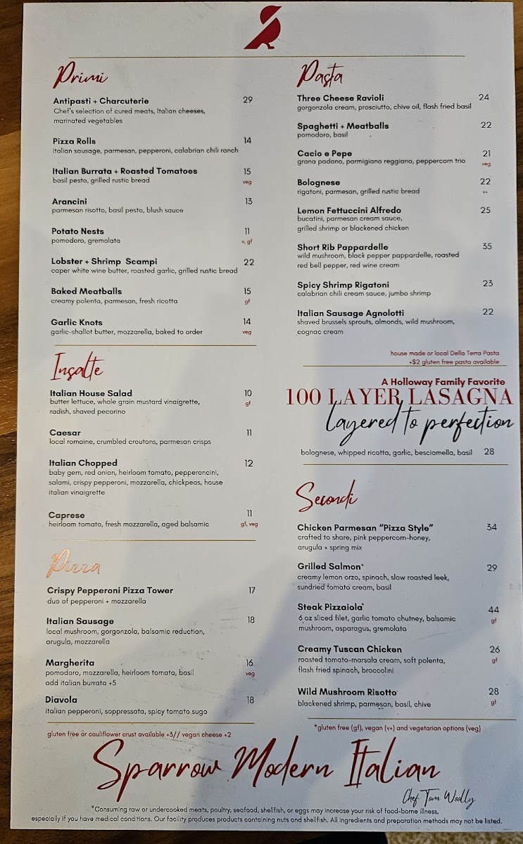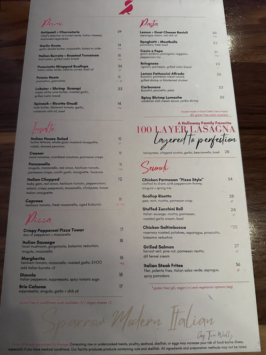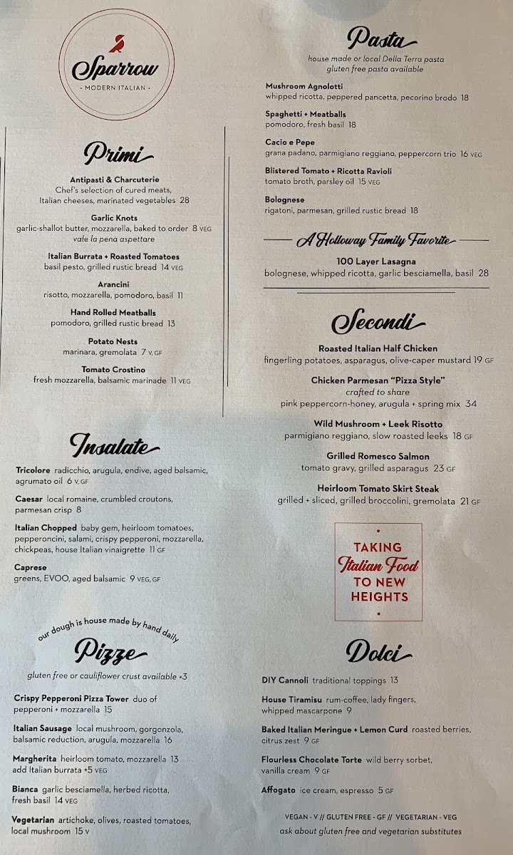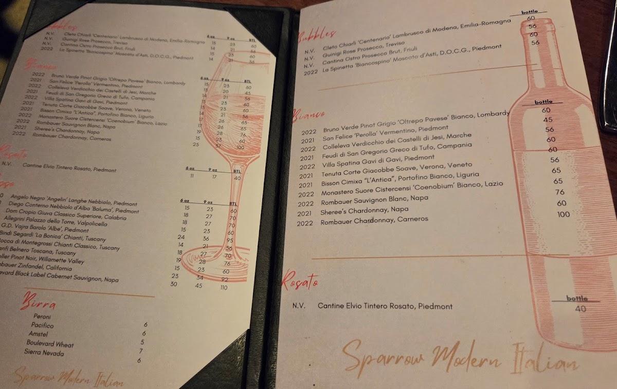 With its combination of traditional and inventive Italian dishes, Sparrow Modern Italian offers a menu that promises something for everyone, whether you're in the mood for a light appetizer or a hearty main course. The variety and quality of the dishes make it a standout destination for both casual dining and special occasions.